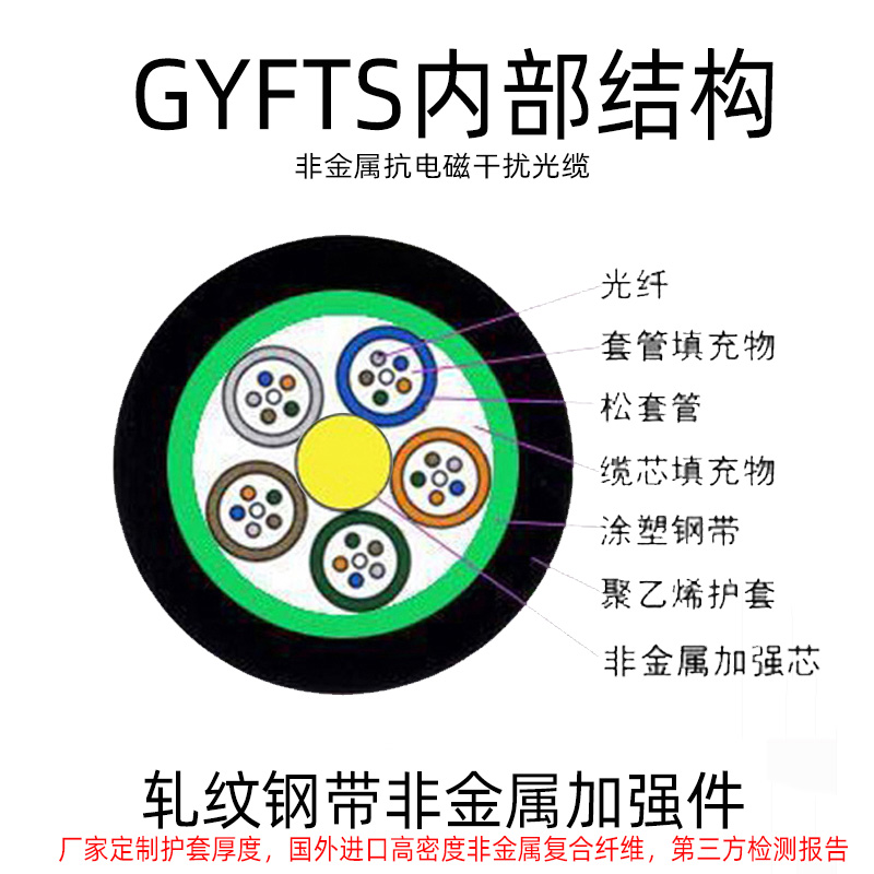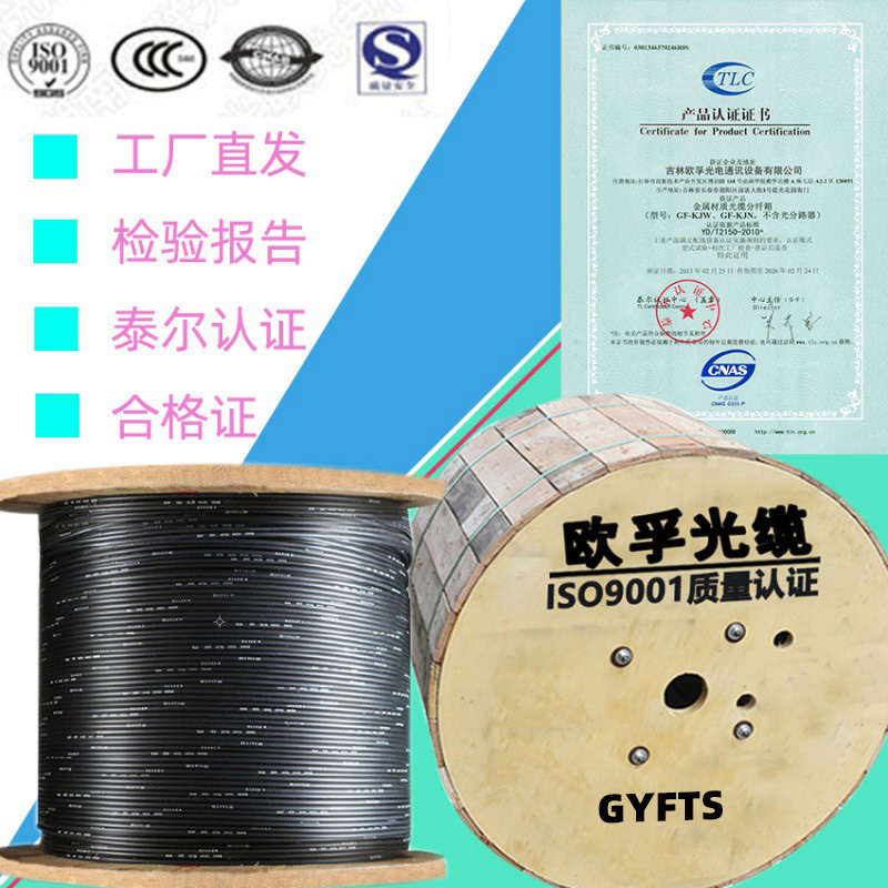 GYFTS光纜,層絞式結(jié)構(gòu),室外用、油膏填充、鋼帶縱包PE護(hù)套。采用層絞式結(jié)構(gòu),光纖套入由高模量聚酯材料制成的松套管中(光纖采用烽火及長飛的A 級(jí)光纖,保證傳輸性能優(yōu)良結(jié)構(gòu)性能穩(wěn)定)套管內(nèi)填充防水化合物。松套管 (和填充繩)圍繞非金屬中心加強(qiáng)芯(FRP)絞合成緊湊的纜芯,纜芯內(nèi)的縫隙充以水油膏。纜芯外擠制PE護(hù)套。